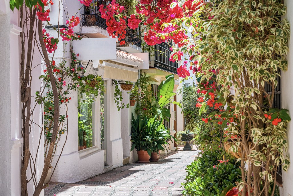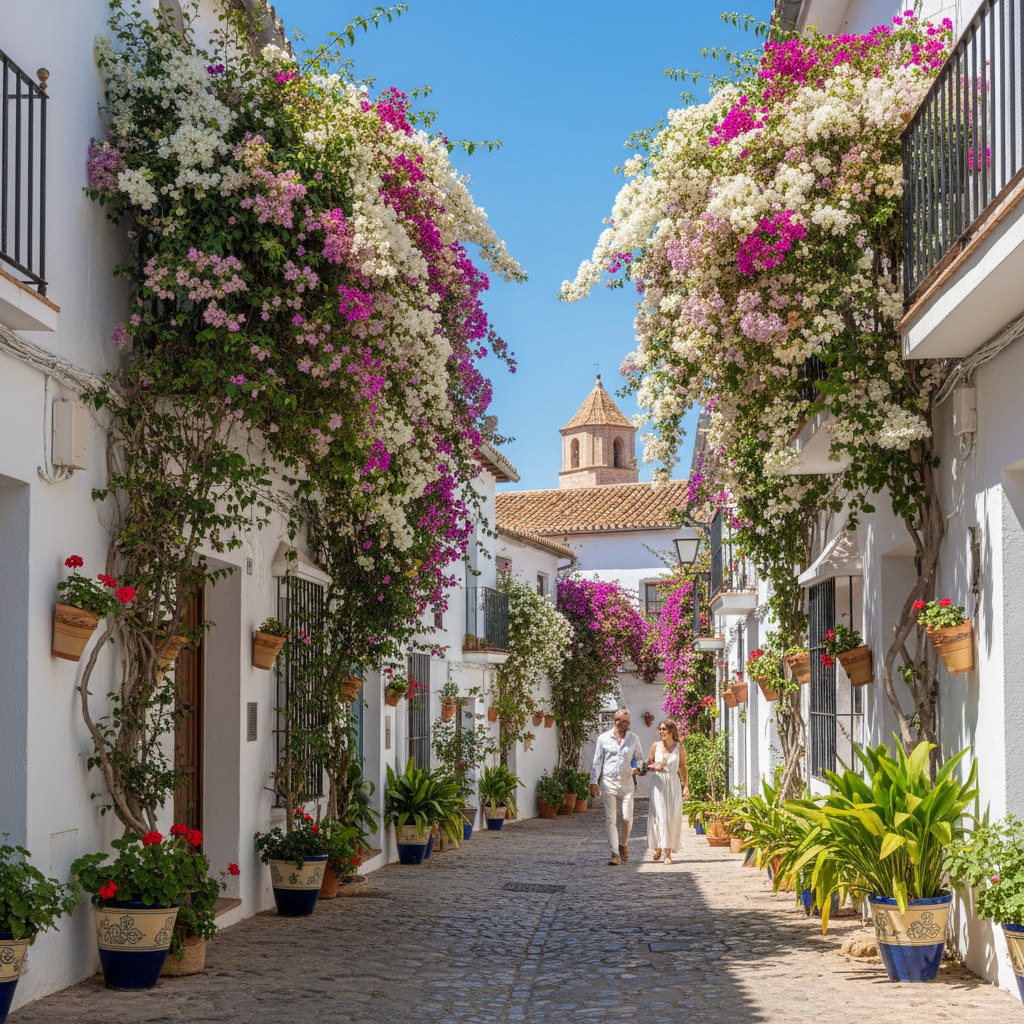 Marbella’s historic center, known as Casco Antiguo, is a haven for bougainvillea enthusiasts. The narrow streets feature cascading pink, purple, and white blooms adorning walls and archways. Key spots include Plaza de los Naranjos and the surrounding alleyways, where bougainvillea complements Andalusian patios and balconies.
