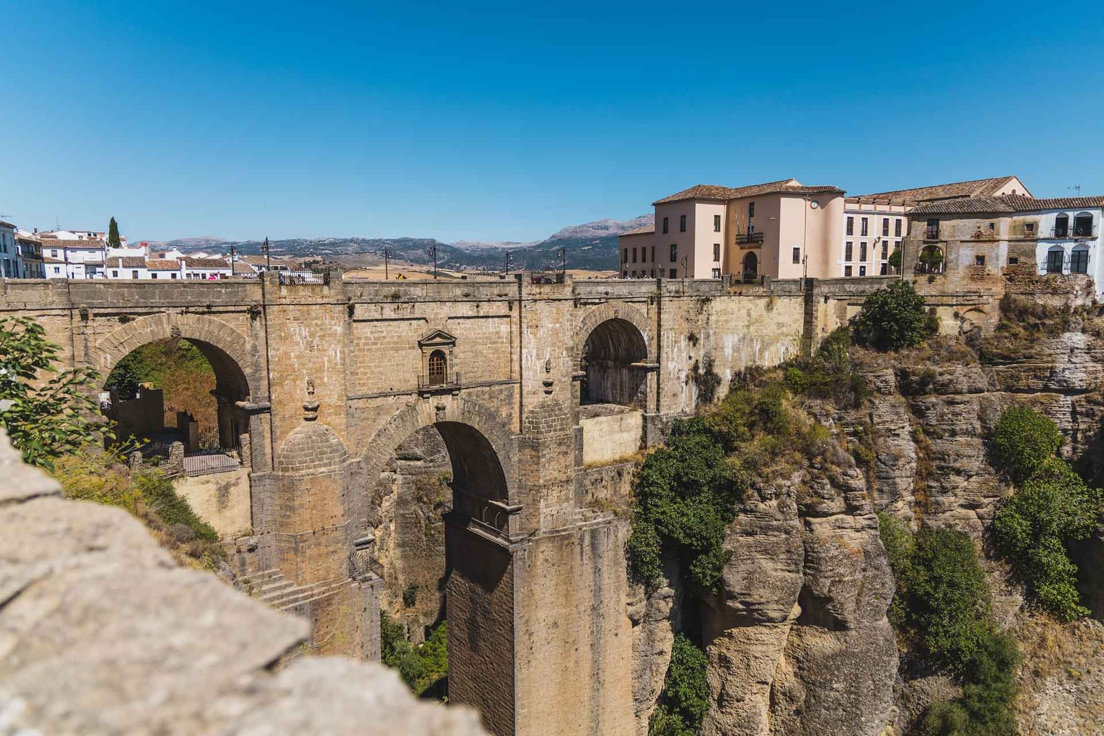 The Puente Nuevo (New Bridge) is Ronda’s defining landmark, though its name is misleading—construction began in 1751 and took 42 years to complete. Designed by architect José Martín de Aldehuela, this engineering marvel stands 98 metres tall and spans the narrowest point of the El Tajo gorge with a single 32-metre arch.